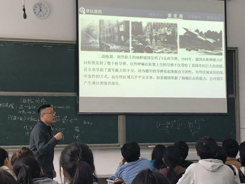 徐立峰老师主讲了《概率论》中泊松分布定理,教学设计新颖分为情景引入、课堂探究、学以致用、巩固提升四个环节。课堂中首先用三幅星空夜景图让学生辨别真假,从而引入对泊松定理的思考,讲授中采用二战导弹轰炸图,疫情感染分布图等生动的事例来进行推导证明,讲授生动有趣,激发了学生的学习兴趣。