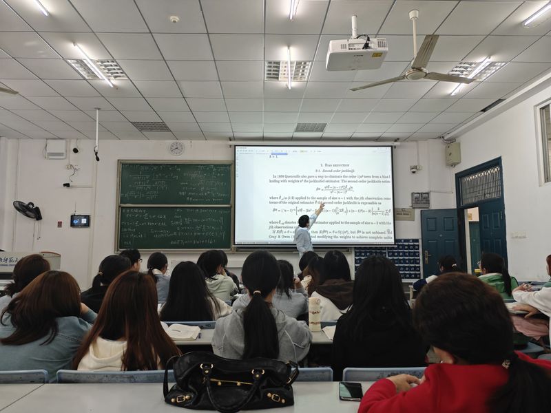 胡宏昌老师主讲的《数理统计》将传统的板书推导和多媒体演示相结合,教学内容紧扣课题研究的最前沿,他巧妙地将自己在科研中积累的经验和洞见融入课堂,让学生们感受到理论知识与科研实践的紧密联系。整堂课,胡老师将所有的知识点、例题都通过板书完美展现,让学生体会到了数学之美的同时,也感受到了科研精神的传承。