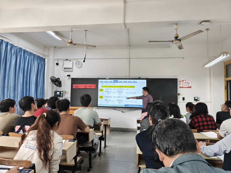 示范课环节,刘伟明老师通过播放“汉字的演变”视频,让学生体会到课题中“恰当”内涵的同时,更感受到中国汉字博大精深,迅速激发学生学习兴趣。结合线上Mooc资源,引导学生主动思考,提出课题。在形成概念阶段,刘老师耐心细致地讲解了恰当微分方程和积分因子的概念及其重要性,帮助学生建立起清晰的知识框架。解法探究环节,刘老师引导学生通过互动探究,共同寻找求解恰当微分方程的方法以及积分因子的求法,使学生在探究过程中逐步深化理解。解题归纳阶段,刘老师对各种解法进行了总结和比较,使学生能够更好地掌握解题技巧。应用拓展环节,刘老师将理论知识与科学应用相结合,通过解决实际问题来巩固学生的知识掌握。引导学生运用所学知识解决实际问题,培养了学生的实践能力和创新思维。课堂小结时,刘老师对本次课的教学内容进行了回顾和总结,帮助学生梳理知识脉络,加深记忆和理解。课后作业部分,为学生布置了分层次的练习题,旨在巩固所学知识,提升解题能力。