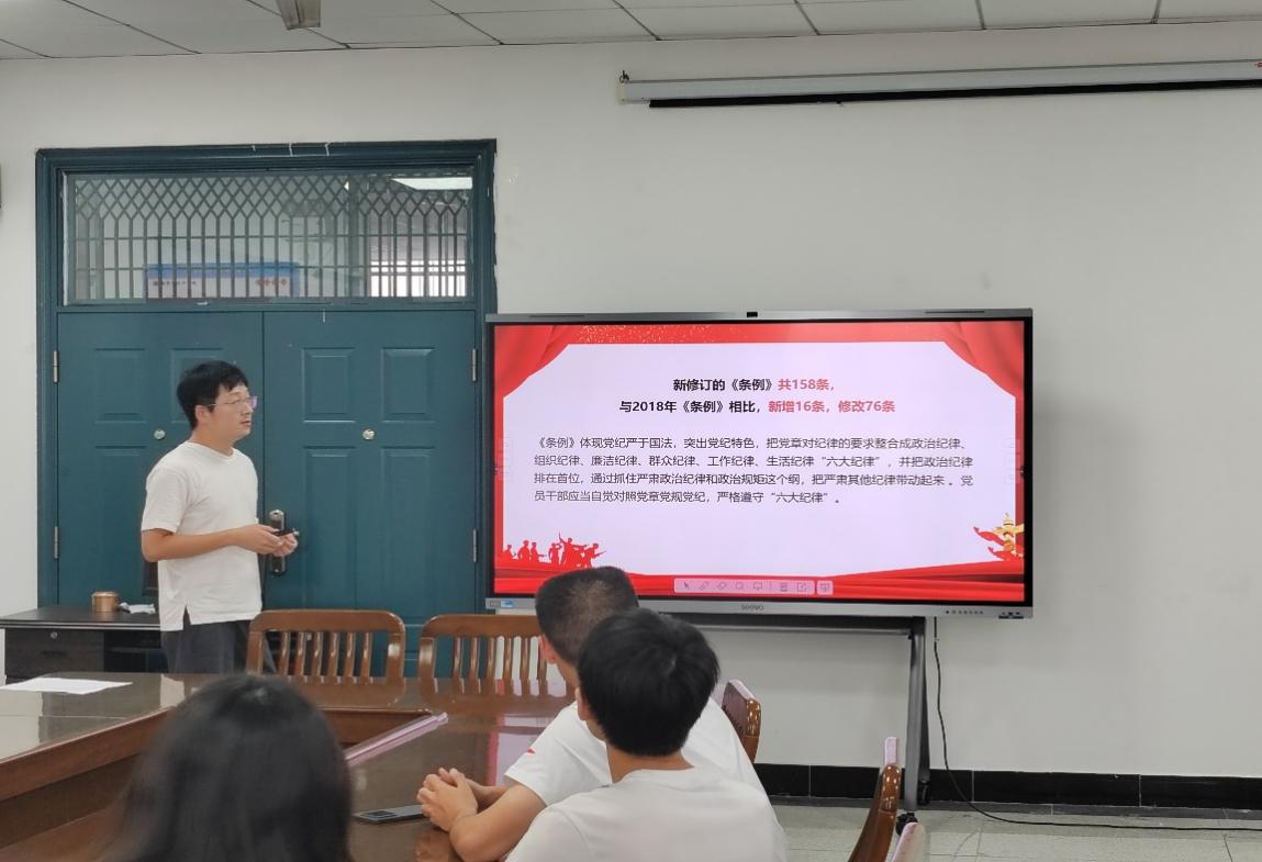 党员杨宇森老师就本次微党课讲授的学习内容分享个人体会,接着党员尚冰同志就查摆问题做出自我批评与改进。会议最后,屈媛媛老师和杨宇森老师为各位党员开展党纪学习教育,将中国共产党纪律处分条例内容与具体实例相结合,希望各位党员同志严以修身,坚定党性,把党的纪律内化为日用而不觉的言行准绳,强化自我约束,促进担当作为,积极做到学纪知纪明纪守纪,切实把学习成果转化为推动高质量发展的实际行动。