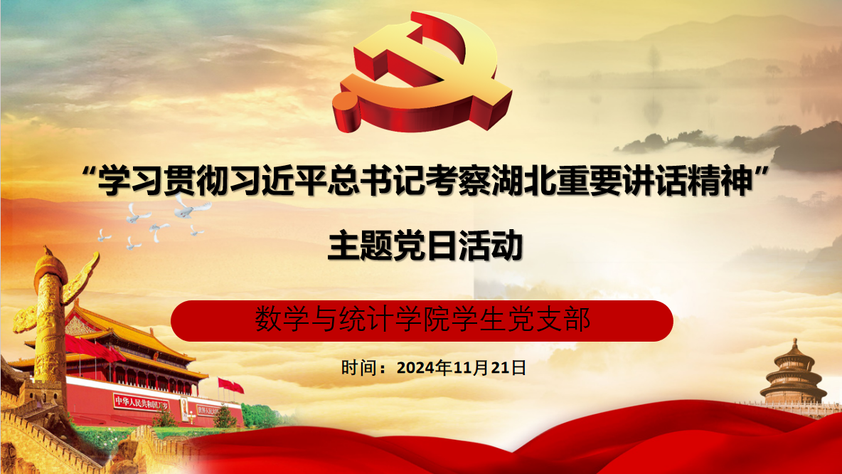 11月21日中午,数统学院学生党支部在信息大楼10604教室召开“学习贯彻习近平总书记考察湖北重要讲话精神”主题党日活动,学生第一党支部书记杨宇森、学生第一、第二支部全体党员参加,学生第二党支部陈安同志主持。