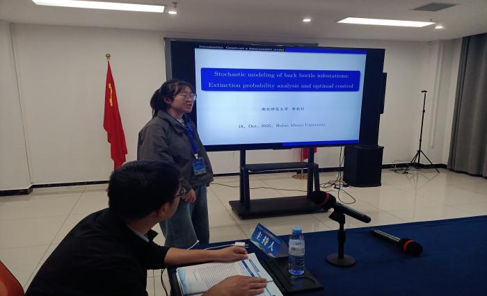姜国院长参加了学科发展与人才培养专题交流会,赵大方副院长于1018日下午主持了分组报告,许靖老师和李秋杉同学分别在分组做了报告分享。许靖以《Near-optimal control of a stochastic model for mountain pine beetles with pesticide application》为题汇报了他的最新工作;李秋杉则以《Stochastic modeling of bark beetle infestations: Extinction probability analysis and optimal control》为题汇报了其硕士阶段的研究成果。