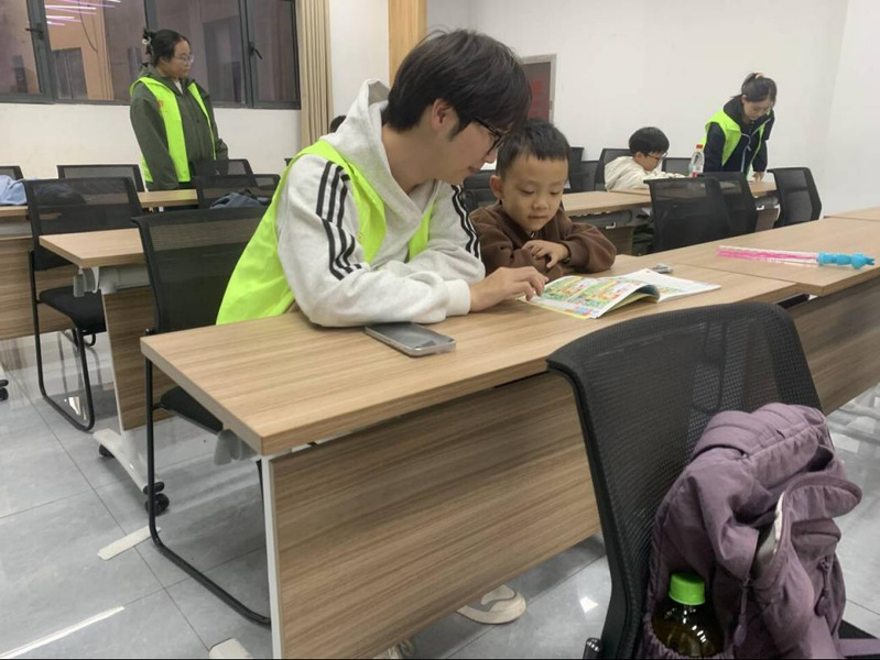 图为志愿者辅导孩子作业