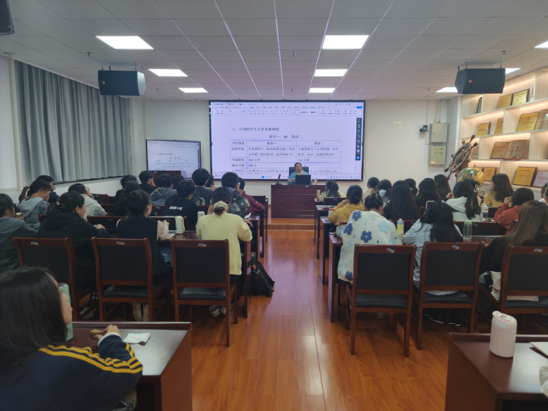 在当晚举行的第二场讲座中,李前老师围绕考研英语备考开展专题辅导。她从全国研究生入学考试的总体情况入手,系统解读了考试科目设置、时间安排和评分标准,深入分析了英语一与英语二在适用专业、考试内容和难度等方面的差异,帮助学生明确备考方向。结合历年真题,李老师详细讲解了各类题型的命题规律和解题技巧,强调了词汇积累与语法基础的重要性,并分享了科学的六周强化训练计划,指导学生合理规划复习进度、提升学习效率。在互动环节,李老师耐心解答了学生提出的各类问题,提供了具有针对性的备考建议。