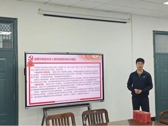 学生党员刘晓锋同志围绕违规为特定关系人谋利、影响公正执行公务、婚丧喜庆事宜违规操办、违规营利等方面,结合《中国共产党纪律处分条例》规定与典型案例开展本次党纪学习教育,引导党员明晰纪律红线,切实强化纪律意识与规矩意识。