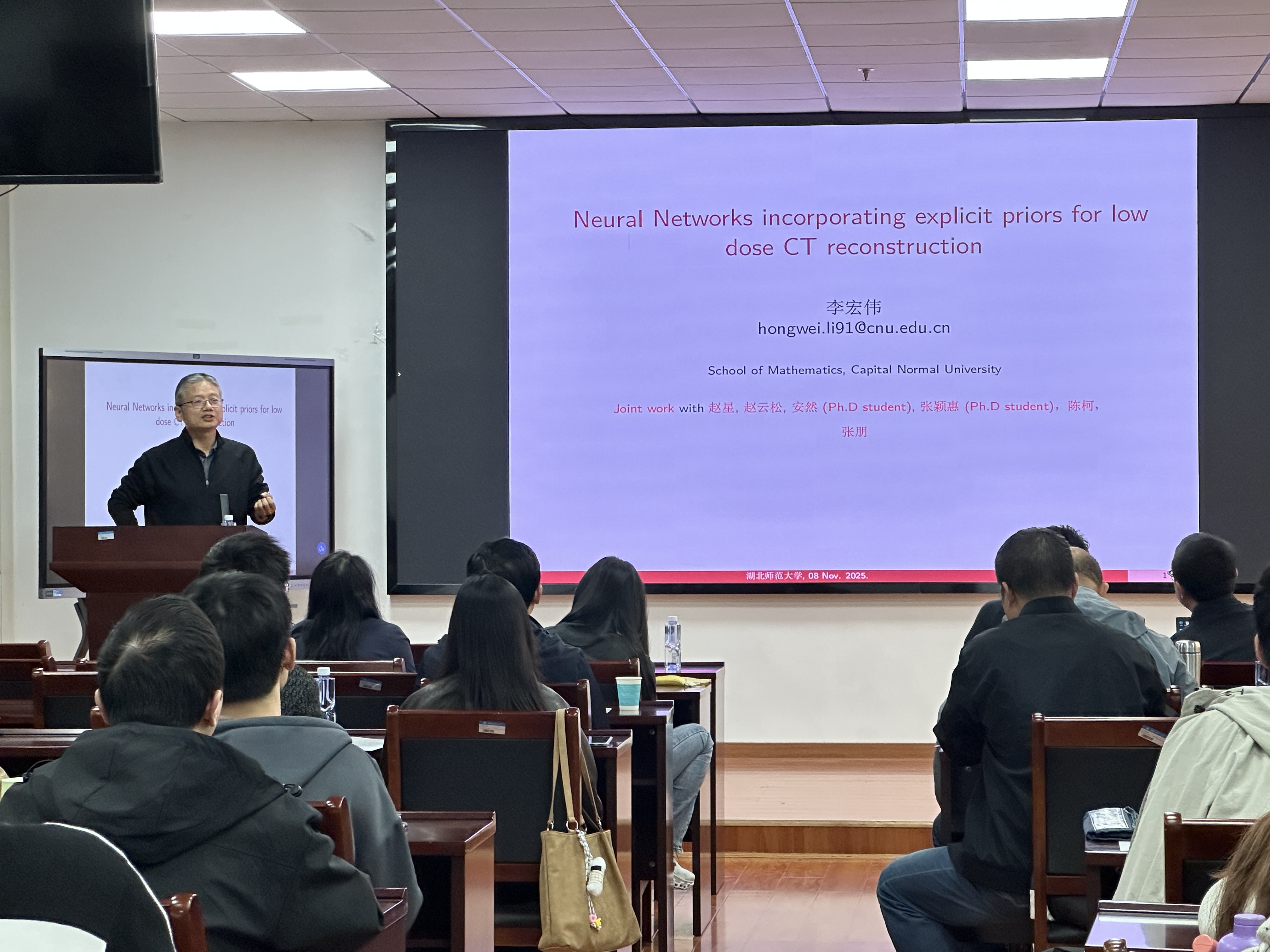 首都师范大学李宏伟教授以《Neural Networks incorporating explicit priors for low dose CT reconstruction》为题作学术报告。低剂量 CT 重建易产生重噪声与条纹伪影,现有诸多方法通过融合投影域或图像域各类先验以提升重建质量。报告将简要回顾该领域主流先验,重点介绍团队近期研究--将噪声统计、物理正演模型等先验明确融入神经网络的低剂量 CT 重建方案,同时简要探讨相关挑战与潜在解决方案。