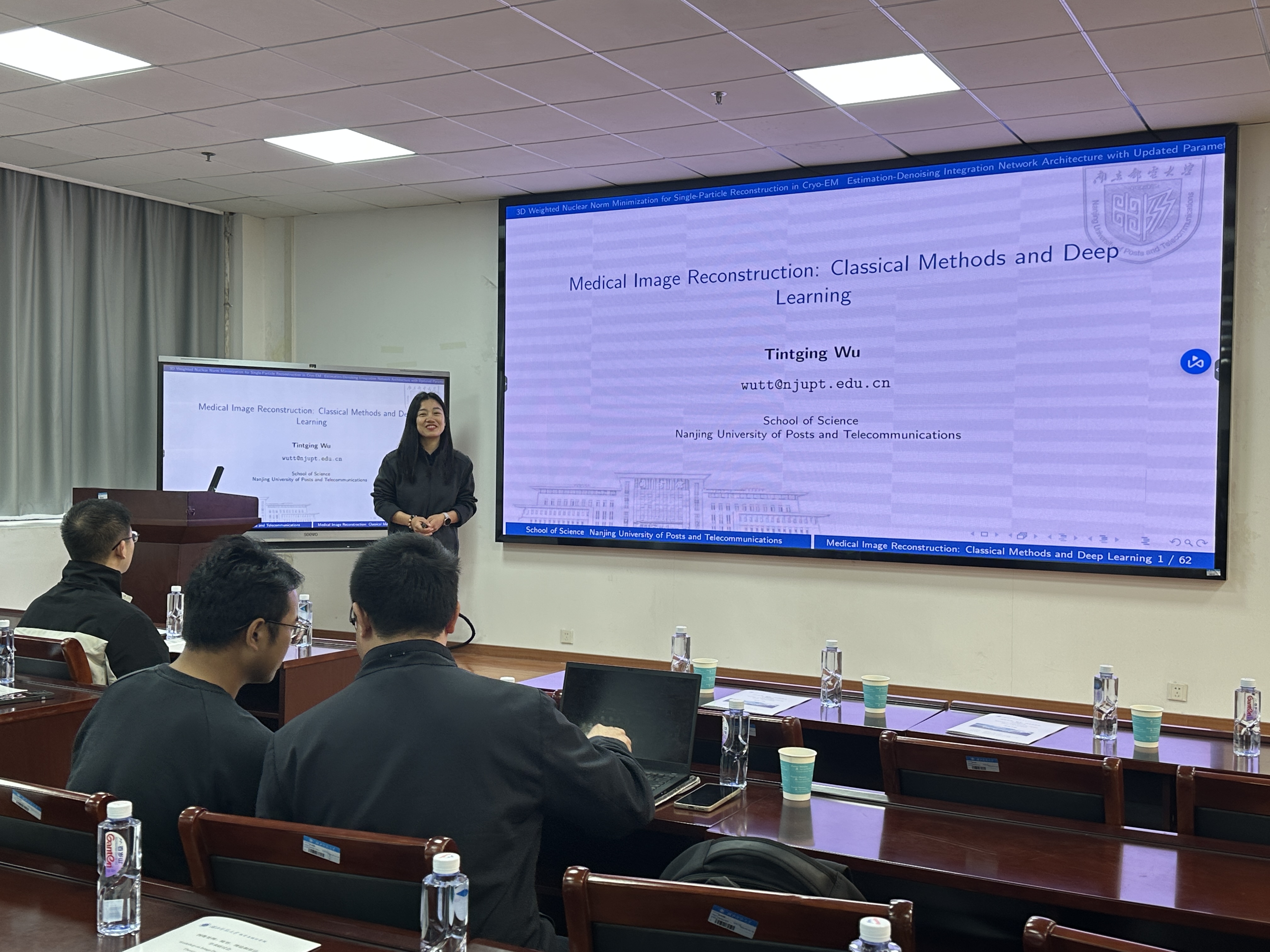会议期间,南京邮电大学武婷婷教授以《Medical Image Reconstruction: Classical Methods and Deep Learning》为题作学术报告。图像重建是计算成像的核心,在低温电子显微镜(cryo-EM)、磁共振成像(MRI)等高噪声场景中尤为关键。武教授针对这两种成像技术提出有效重建策略,显著提升了重建精度与鲁棒性。针对 MRI,她设计了含可学习噪声估计模块的增强即插即用框架,通过两阶段网络实现自适应去噪与重建,频域先验则进一步优化了空间细节表现。
