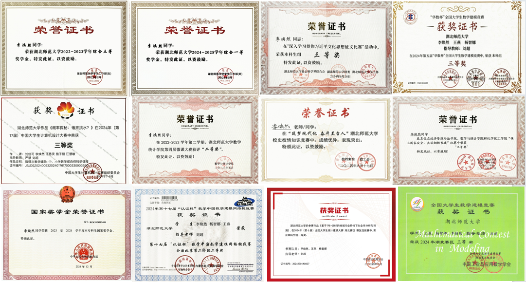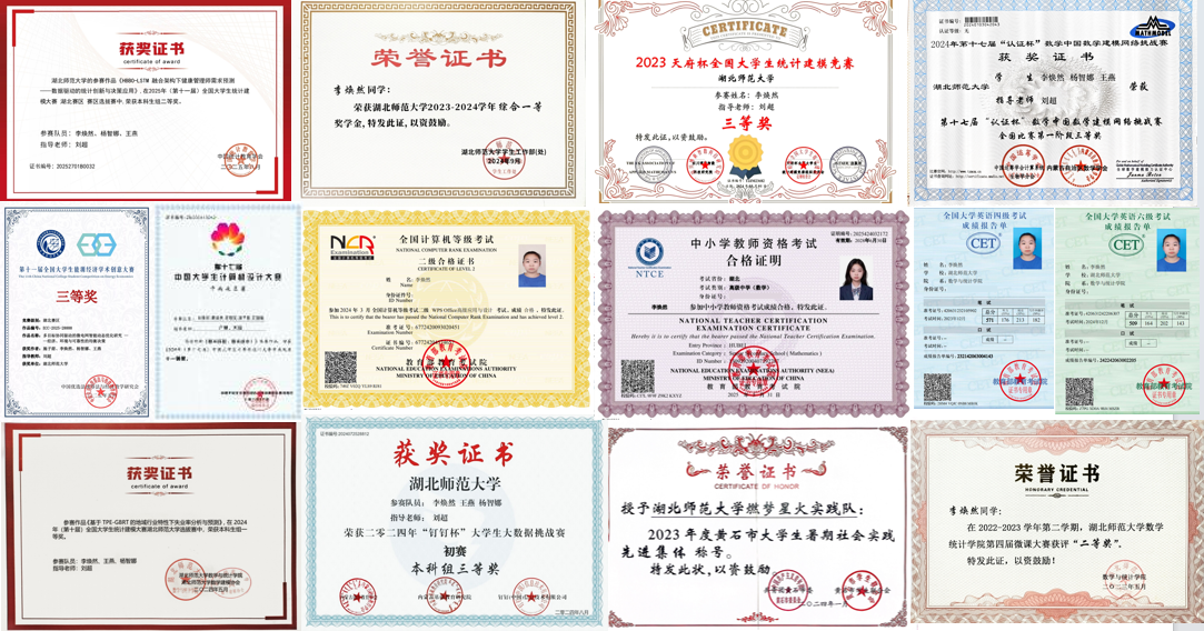普通话等级一乙、英语四级571分、英语六级509分、通过了计算机二级考试与高中数学教师资格证考试。