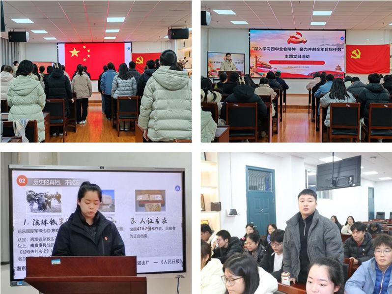 在庄重严肃的氛围中,全体党员依次交纳本月党费、重温入党誓词、并集中诵读《中国共产党章程》第七章三十九条至四十一条,进一步强化党员理想信念。刘倚滢同志围绕“群众纪律的本质要求与行为底线”等内容开展党纪教育,强调各位党员应做到知纪明责、廉洁履职,切实维护党和人民群众的血肉联系。余佳佳同志围绕“南京大屠杀”主讲微党课,号召党员以史为鉴,传承抗战精神,捍卫和平。在畅谈心得中,李焕然、江思媛两位同志表示应牢记历史,坚定信念,化悲愤为强国动力,坚定不移地走好民族复兴之路。