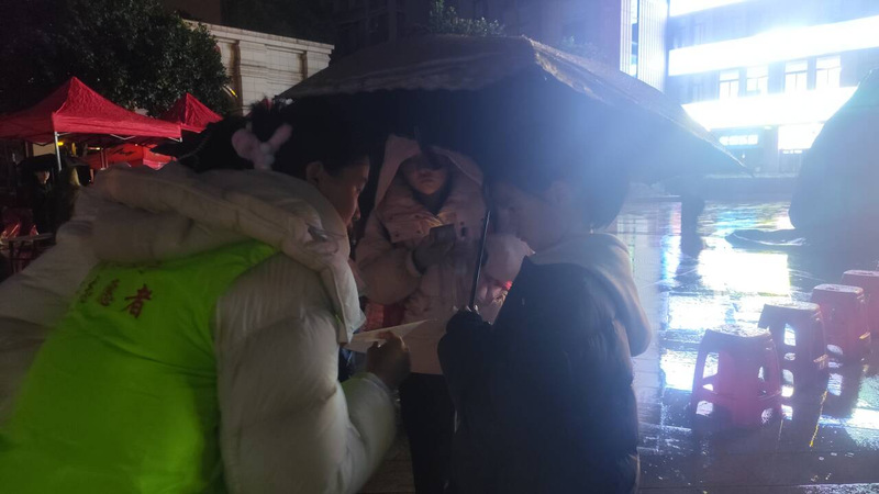 活动现场,跨年集市、音乐会、戏曲表演等精彩纷呈。志愿者们分工明确、协作默契,有的化身“环保小卫士”,撑伞穿梭在广场各个角落,捡拾垃圾,保持活动场地整洁;有的驻足表演台下,与观众一同沉浸在跨年氛围中;还有的专注负责安全知识问答环节,耐心引导孩子们参与,为答对问题的孩子送上精心准备的小礼物,清脆的笑声盖过了雨声,成为现场最动人的声音。